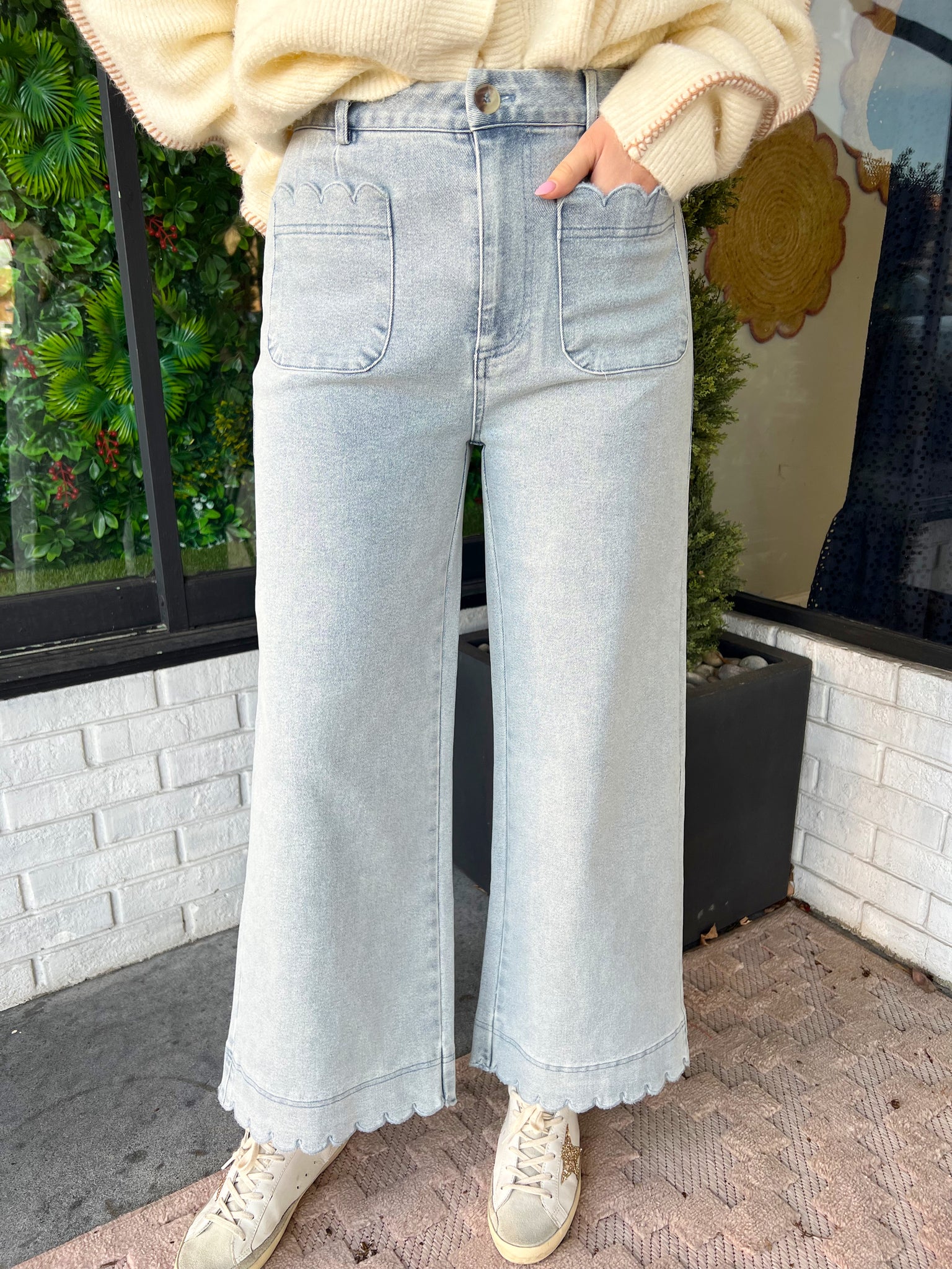 Light Wash High Waisted Wide Leg Scallop Trim Pants. Featuring Front Pocket Detail.