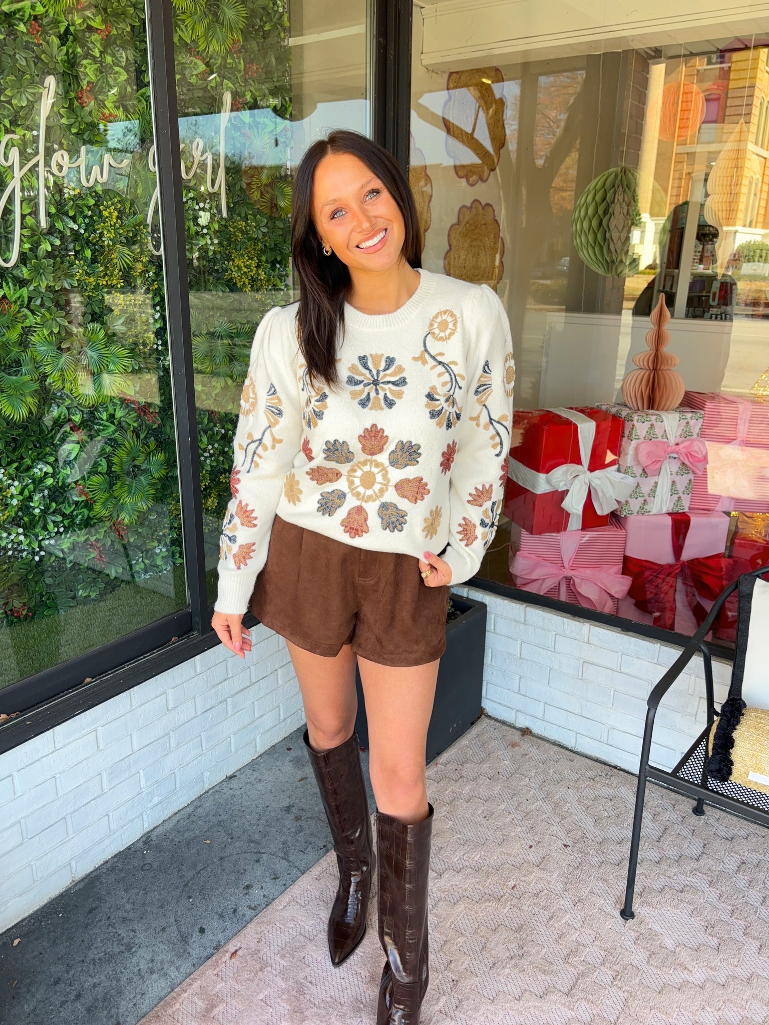 Cream Multi Color Floral Embroidered Knit Sweater. Featuring Slight Puff Sleeve Detail.