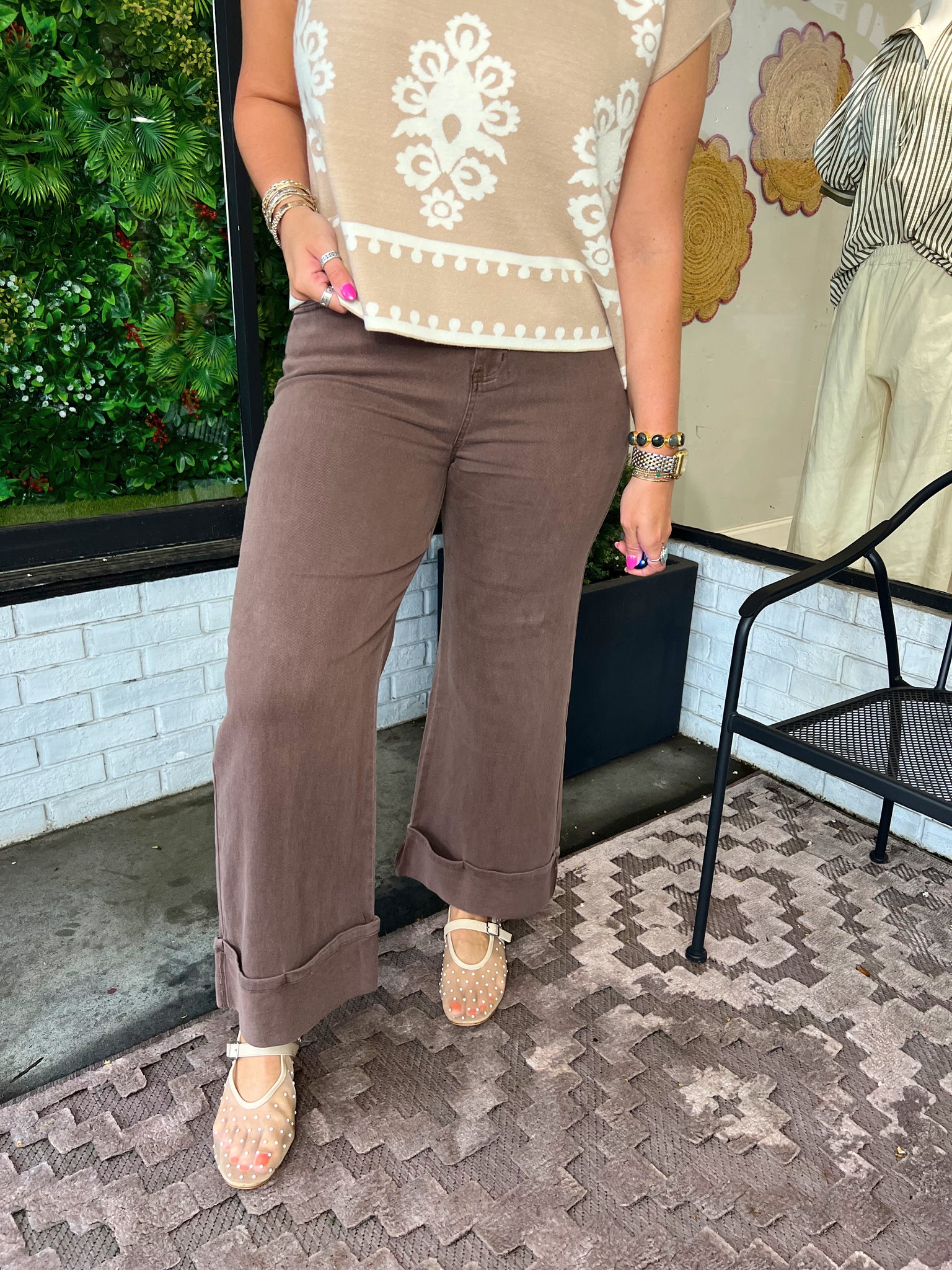 Brown Mid Rise Ankle Length Wide Leg Cuff Pants. Featuring Button Zipper Closure.