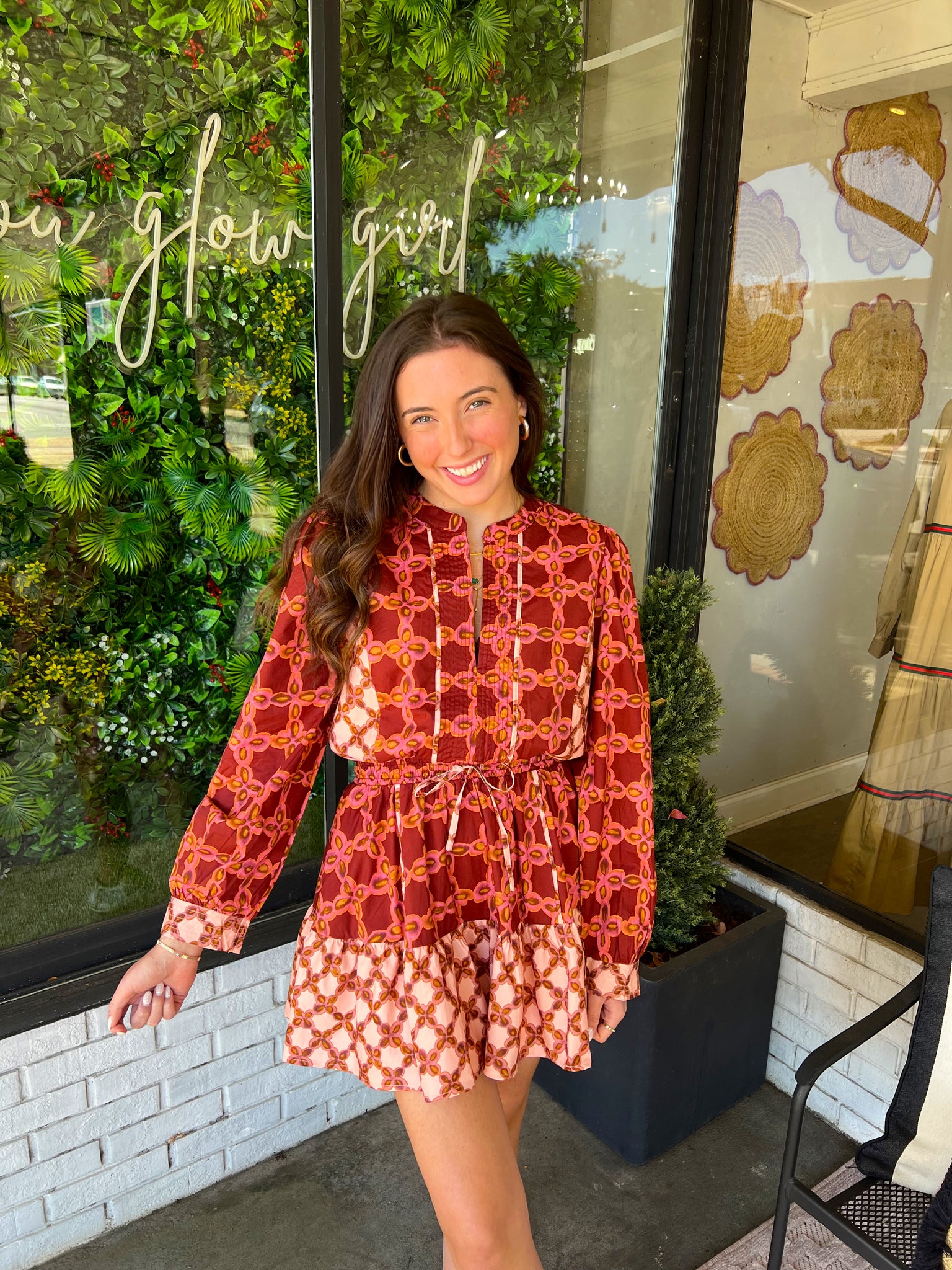 Pink & Burgundy Floral Chainlink Printed Mini Dress. Featuring Long Sleeve & V-Neck Detail. Self Tie Waist Detail. Color Block Detail