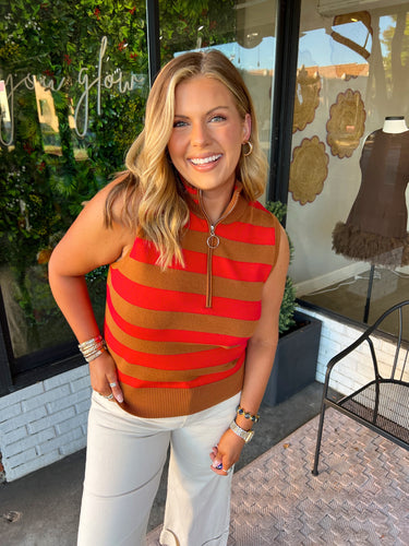 Lydia Striped Sleeveless Knit Top- Red/Camel