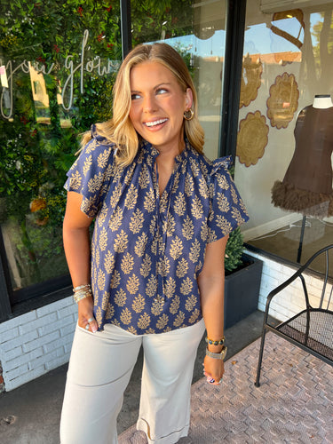 Elizabeth Botanic V-Neck Ruffle Sleeve Top - Navy