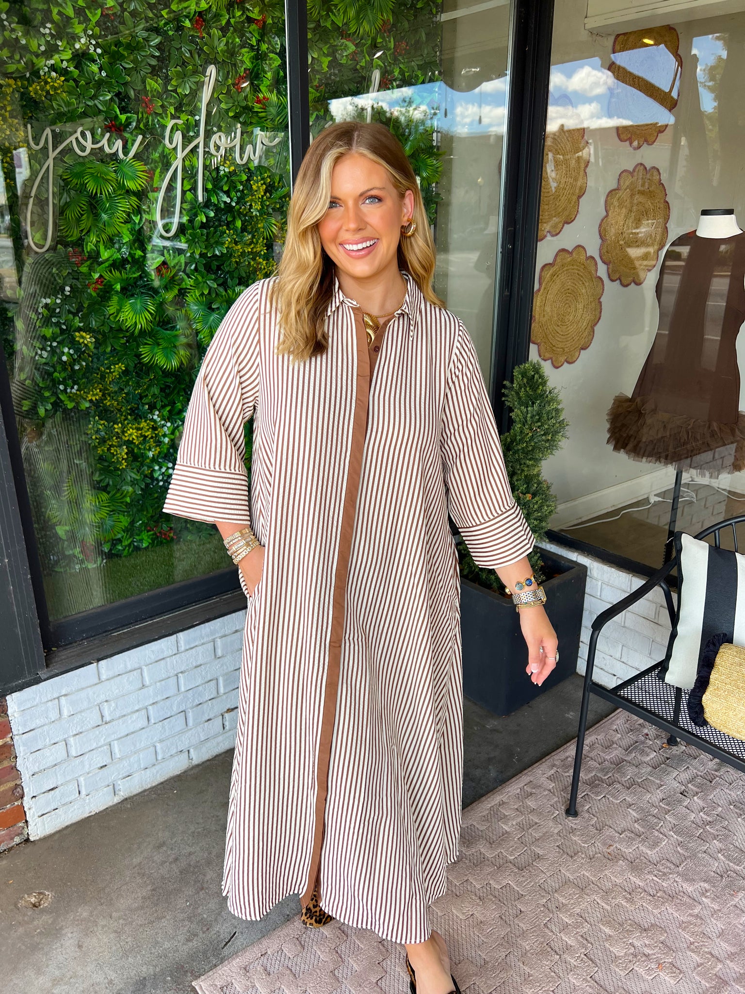 Brown Striped Button Up Collared Midi Dress. Featuring Hidden Button Closure. Side Pocket Detail