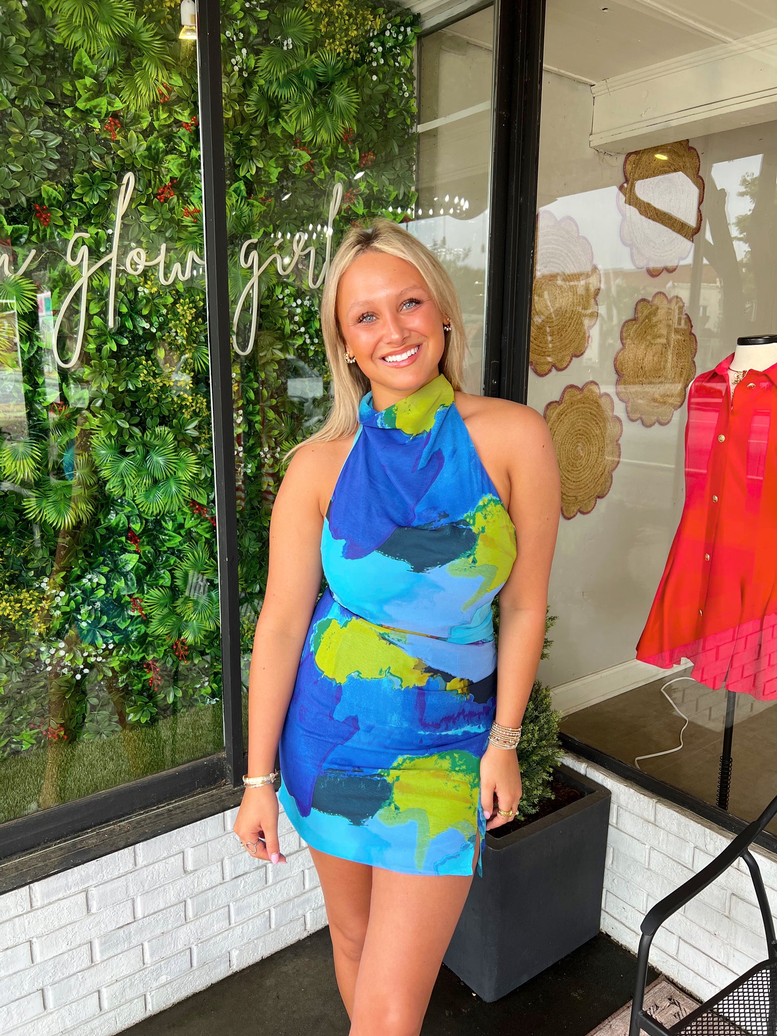 Blue & Green Abstract Watercolor Halter Neck Mini Dress. Featuring Back Zipper Closure Detail. Button Closure at Halter Neck