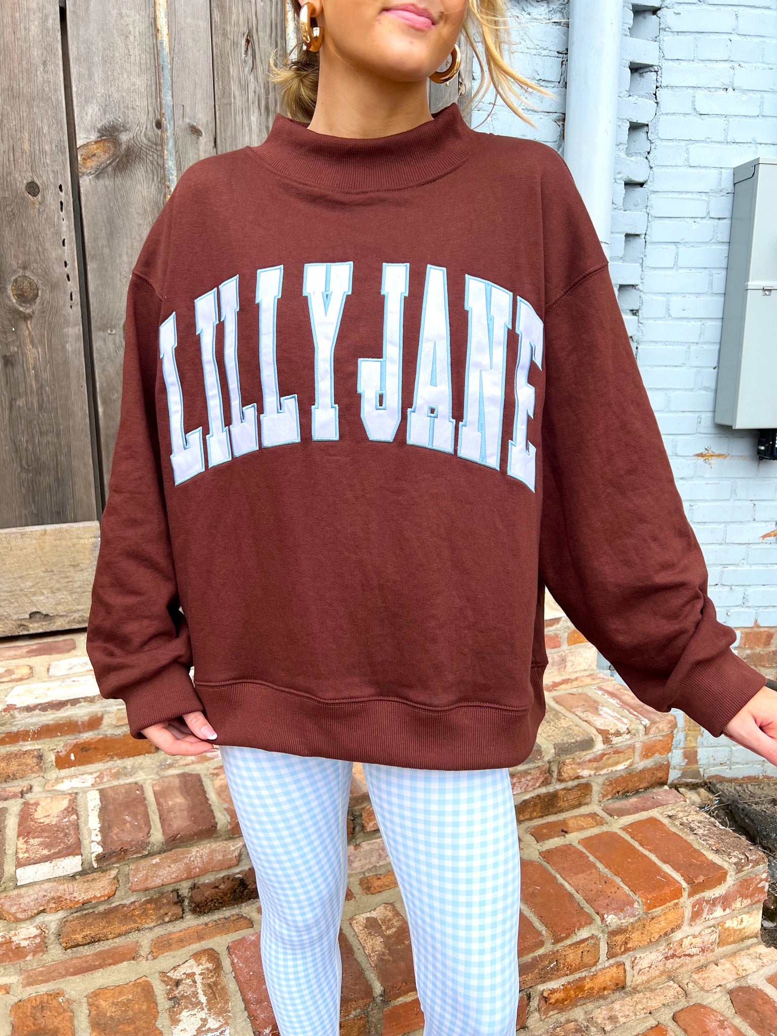 Brown Mock Neck Flowy Oversized Sweatshirt. Featuring Varsity White Lilly Jane Embroidered in Light Blue Outline