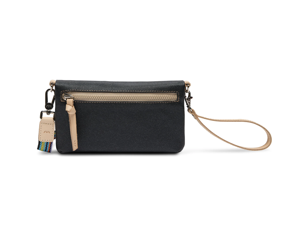 - Included detachable wristlet strap and adjustable woven crossbody strap
